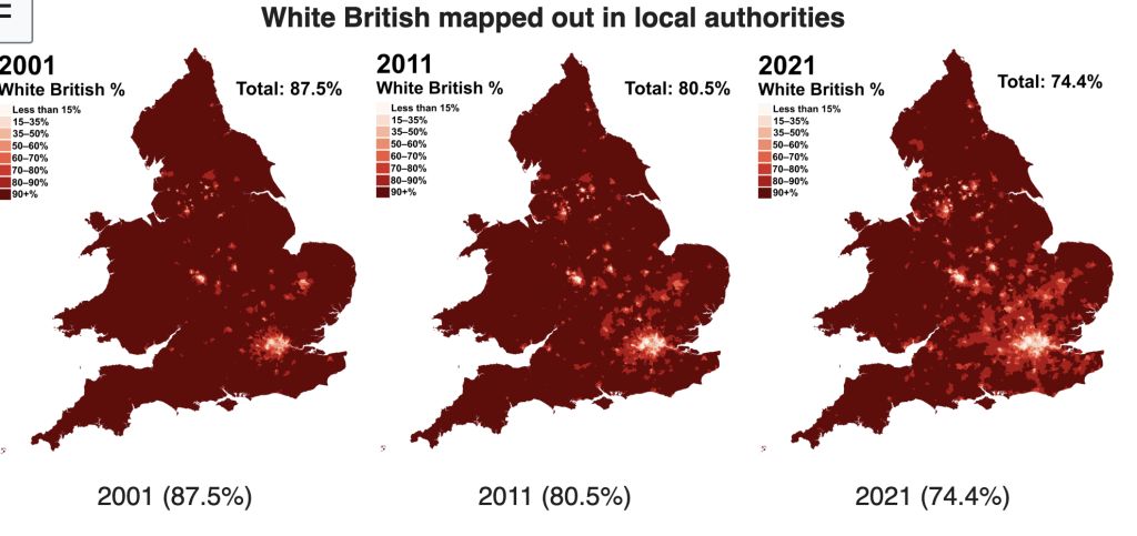 >>533669610Going off current population numbers since the British population is in decline, it would be around 68.9% white British now.