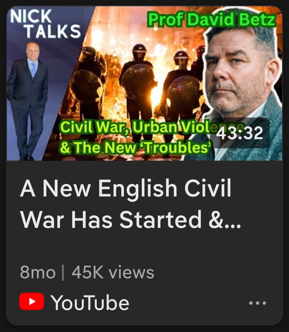 >>533669610david betzHe has recently described a future UK where: 23,000 people die annually in communal violence. Neighborhoods resemble "Baghdad circa 2008." Paramilitaries engage in "kidnapping each other’s children and drilling their kneecaps out." "Half a dozen Grenfell Towers" go up in flames in a single winter due to infrastructure sabotage and lack of fire services.Most political scientists point out that the UK lacks the fundamental requirements for civil war: there are no organized rebel armies, no clear territorial boundaries between factions, and the vast majority of the public—while annoyed with the government—is not interested in killing their neighbors.The Verdict: Is he "Crazy"? To the mainstream (The "Blob"): Yes. They view him as a scholar who has been "captured" by his own dark research, using his credentials to fuel right-wing panic and "racializing" complex social issues. To his followers: No. They see him as a "Galileo figure"—the only person in a room full of delusional optimists willing to say the house is on fire. To a neutral observer: He is a highly radicalized strategist. He is applying the logic of "failing states" (like Lebanon or Yugoslavia) to a stable Western democracy. Whether that is a brilliant insight or a total misreading of British culture is something we will know for sure by the end of 2026.in short the far right think he's a superstar.if there's no civil war before the end of 2026, then he;s a nutjob. pro tip ... there won't be any civil war in uk