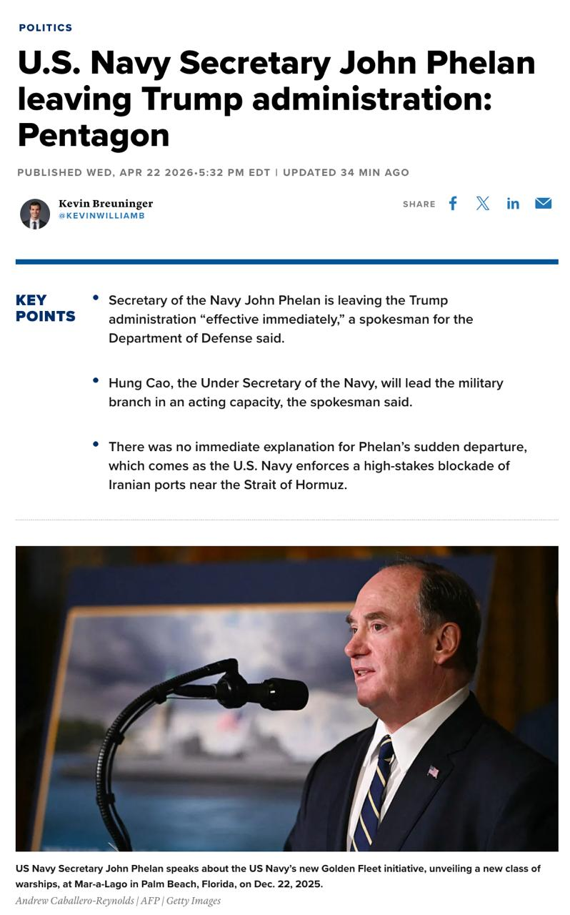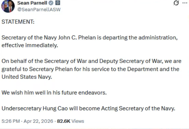 Secretary of the Navy John Phelan is leaving the Trump administration “effective immediately,” a spokesman for the Department of Defense said Wednesday.“On behalf of the Secretary of War and Deputy Secretary of War, we are grateful to Secretary Phelan for his service to the Department and the United States Navy,” the spokesman, Sean Parnell, said on X. “We wish him well in his future endeavors.”Hung Cao, the Under Secretary of the Navy, will lead the military branch in an acting capacity, Parnell said.Parnell did not provide an explanation for Phelan’s sudden departure, which comes as the U.S. Navy enforces a high-stakes blockade of Iranian ports near the Strait of Hormuz.The key oil-shipping route has become a major choke point in the U.S.-Israeli war against Iran.