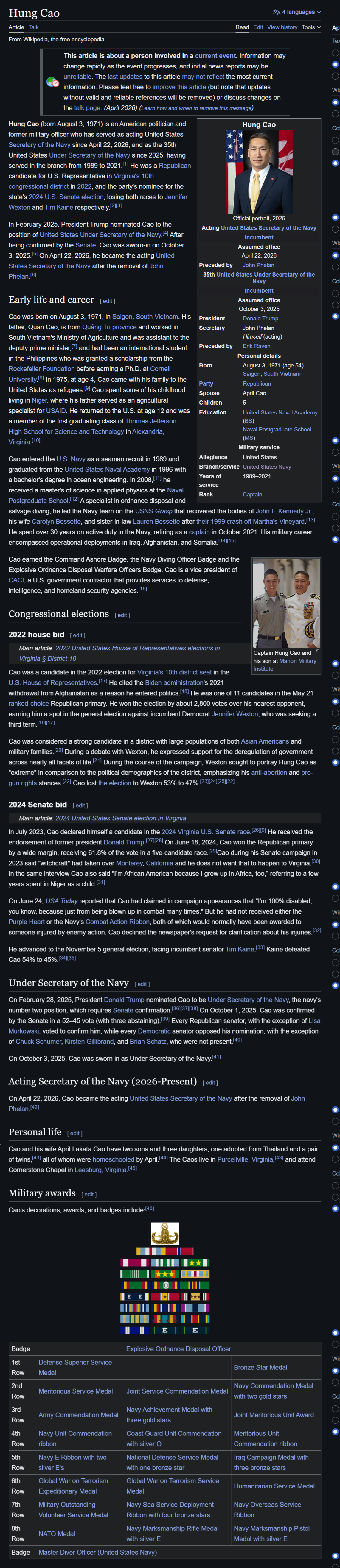 The new US Secretary of the Navy is Hung Cao, as mentioned in the above post. He was born in Saigon (Ho Chi Minh city), south Vietnam.
