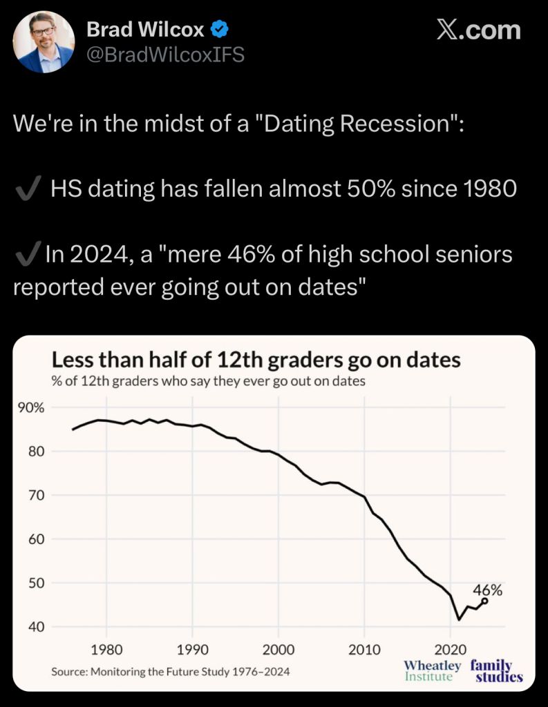>>533676465It’s because of all the porn destroying the dopamine in kids. They have no drive to go on dates when they get their fix by the click of a mouse in under 30 seconds.