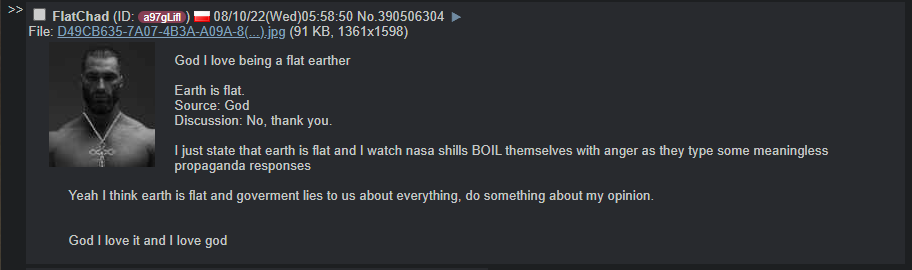 >>533677894>flat earthand>space isn't reallarpers are the purest form of trollingthey literally base their beliefs on>i haven't seen it personally>so it must not existand since most people>alsohaven't seen it, they literally get their>"credibility"from ignorancea lot of them also haven't seen>chinaor>a million dollars that doesn't mean these things don't existthey can't even prove the earth is flatthey're just literal contrarians that get a buzz from being little fags