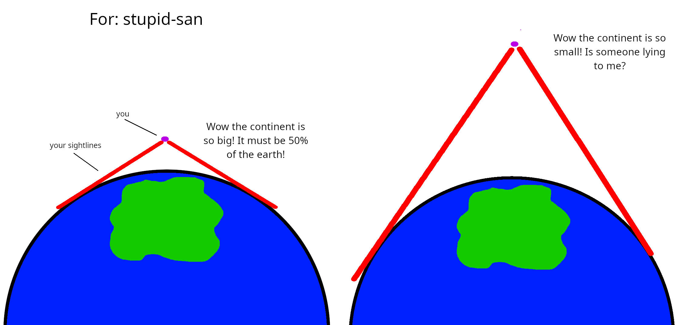 >>533680355He literally explained it - your view is limited to the horizon, but your horizon changes with altitude. You can literally demonstrate this effect if you've got a tennis or baseball around. Hold it at arms' length until the logo/seam/something identifiable is just at the edge of what you can see. Then bring the ball closer to your eye without tilting it. You'll see the logo/seam/whatever disappear. Same shit, but with continents taking up a larger or smaller part of the part of the sphere you can see as you get farther away.