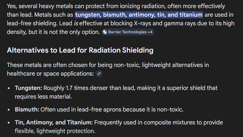 >>533685970Guess what, lead blocks X-rays and gamma rays while the others don’t, read your own lazy ai research and they didn’t use those dense metals either. Especially titanium kek you MORAN.