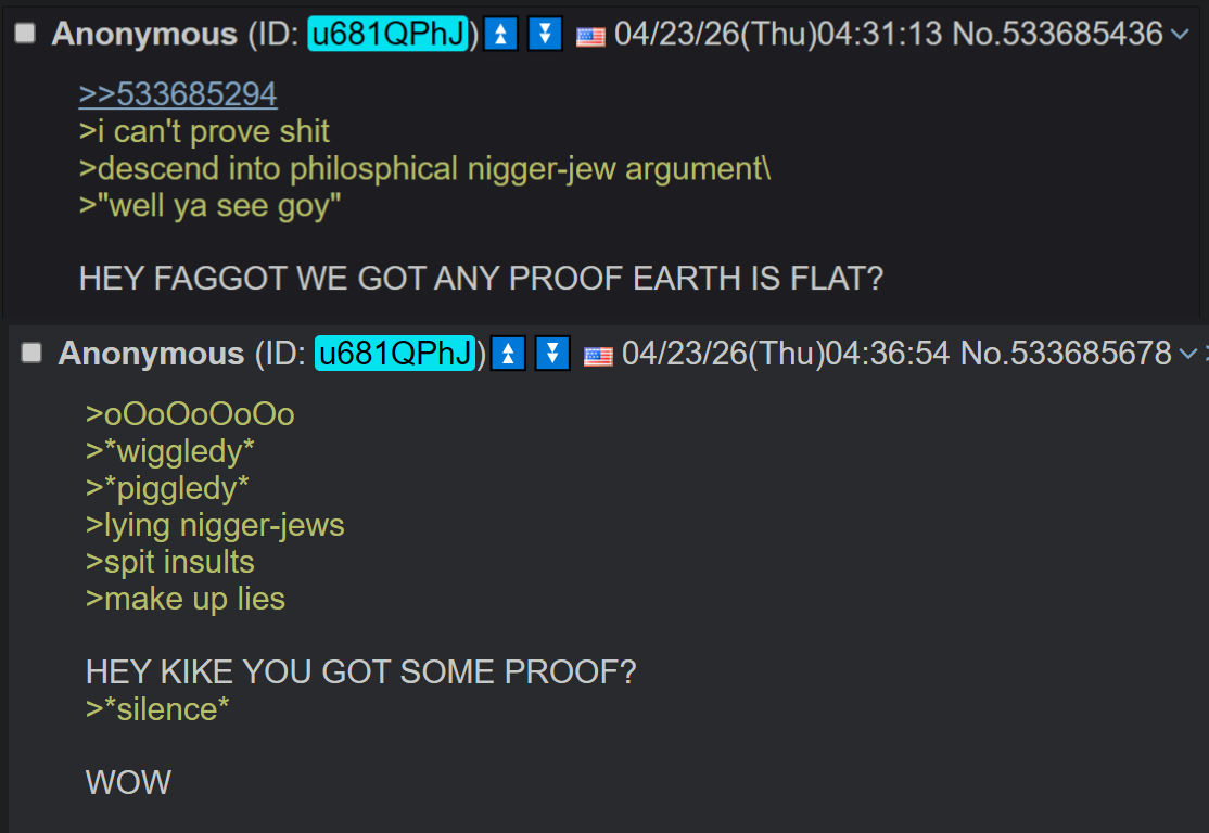 >>533685294>i can't prove shit>descend into philosphical nigger-jew argument\>"well ya see goy"HEY FAGGOT WE GOT ANY PROOF EARTH IS FLAT?>uh>uh>er>ur-ur-ur STUPID if you believe it's a GLOBE!go home kike, you're too stupid to trick anyone here