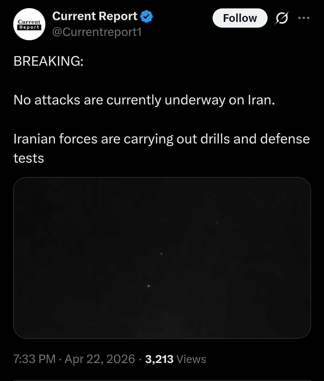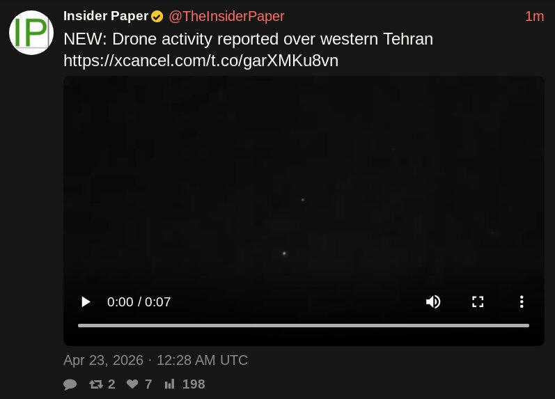 >Drone activity reported over western TehranSomething might indeed be happening.>https://xcancel.com/TheInsiderPaper/status/2047110376568086726