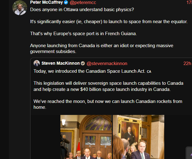 >>533680947>>533681266Good luck to them desu. Canada is having a prolonged meltdown because I think their pride has been hurt. They apparently thought their country was important and meaningful or some such inflated ego but when they realized no one gives a shit about them and they're not a major power they freaked out.It's certainly possible to launch from Canada but it would be significantly more difficult and expensive. They'll figure that out and presumably calm down in a few years.