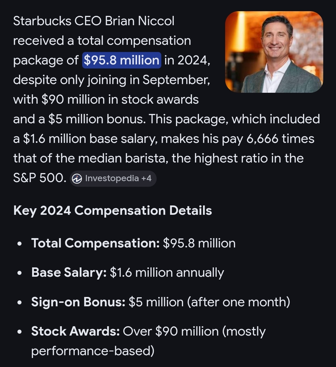 >>533683228They're women, which is to say, stupid. They don't have the foresight to see the effects. Starbucks will not sacrifice the profit of its shareholders, they will raise prices and destroy demand for their product. The business will suffer either way, it doesn't matter, and when the business reaches a threshold of demand destruction it can no longer tolerate, it will take it out on the workers by closing locations, cutting hours so everyone is a part time employee without benefits, and increasing turnover of employees to avoid raises.