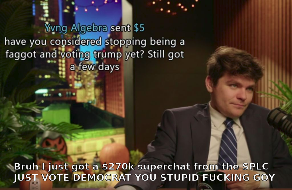 >>533683778Controlled op to make the right look bad.Guy says Epstein is cool for living the playboy lifestyle while he is a Catholic preaching chastity lmaoGuy claims to be counter-semetic but praises a goyim raping/eating Jewish pedophile blackmailing America for IsraelGuy claims to be trad, but is unwilling to get married, have kids and is constantly hanging around fags like Milo, Ali, Catboy and bis like Clav and Destiny Ultimately, he can say the right things when you listen to longer interviews, but when the time comes, he will make the right look bad like he did on January 6th getting peopled jailed while he escapes or when gay porn played on his stream or your body my choice debacle. Why? He is blackmailed no doubt, a flaming faggot like him would be so easy to get dirt on.And the point of blackmailing him isn't to turn him into a leftist, it's to subvert the right into bad ideas (supporting left wingers), push out horrendous optics (supporting Epstein and selling his merch) and divide the right with his continual chimp outs on other right wingers (Nicks been kicked out of 109 friendships and its never his fault)