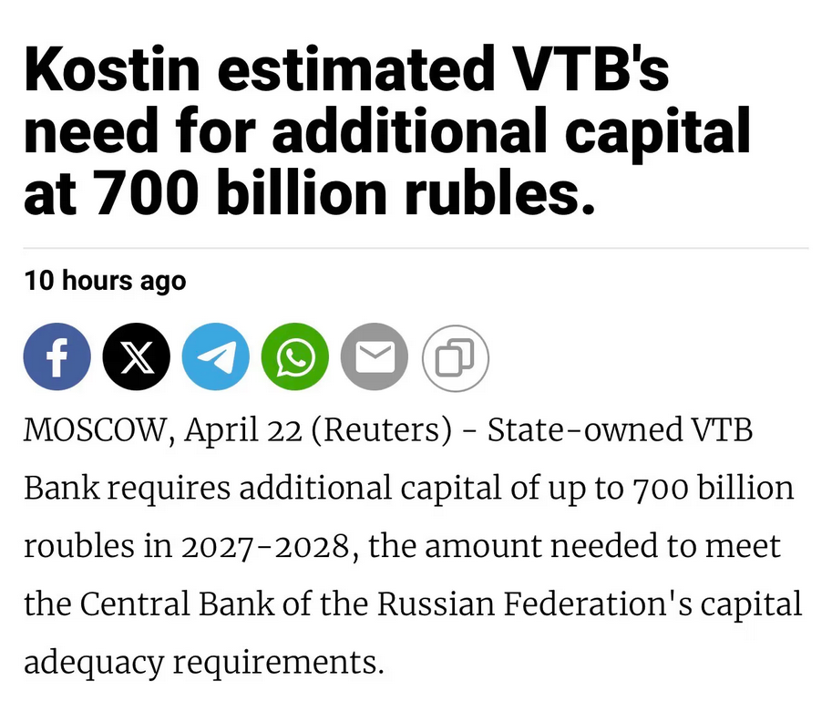 >>533695335IIRC Kostin said the bank needs close to 2T over 5 years so that 0.7T is 'frontloaded' on the central bank's current regulation trajectory. It will only tighten rather than loosen so really VTB needs more faster. Asset sales are going to be necessary I think, but who's buying? At the very least they can release some new shares but I doubt that will generate more than a hundred bill or thereabouts.