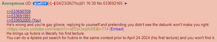 >>533690709>>533691991>>533692005He's wrong and you're gay glowie, replying to yourself and pretending you didn't see the debunk won't make you right.>https://www.youtube.com/watch?v=xEEpOxqdU5E&t=774He brings up hubris in literally his first lecture.You can do a 4plebs pol search for hubris in the same context prior to April 24 2024 (his first lecture) and you won't find it.