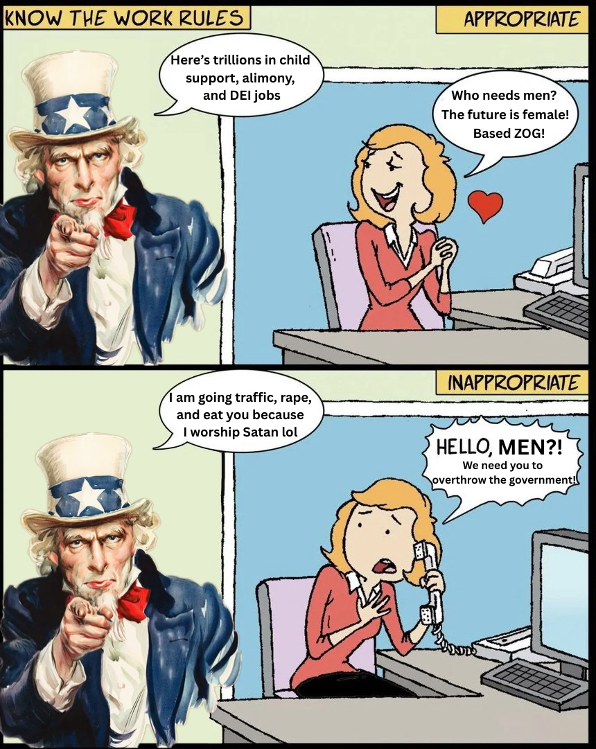 >>533690051its all up to women. And if women have taught me anything, its to not expect responsibility or accountability from them. i mean, its possible in theory and would be basically effortless but again, i learned to expect nothing from women.we give women guns and they call us oppressorsJews give them feminism and they call it empowerment. im pretty sure we were eventually defeated and are doomed to extinction. the world is gonna be fucked and suck so hard without us its actually a little funny to think about