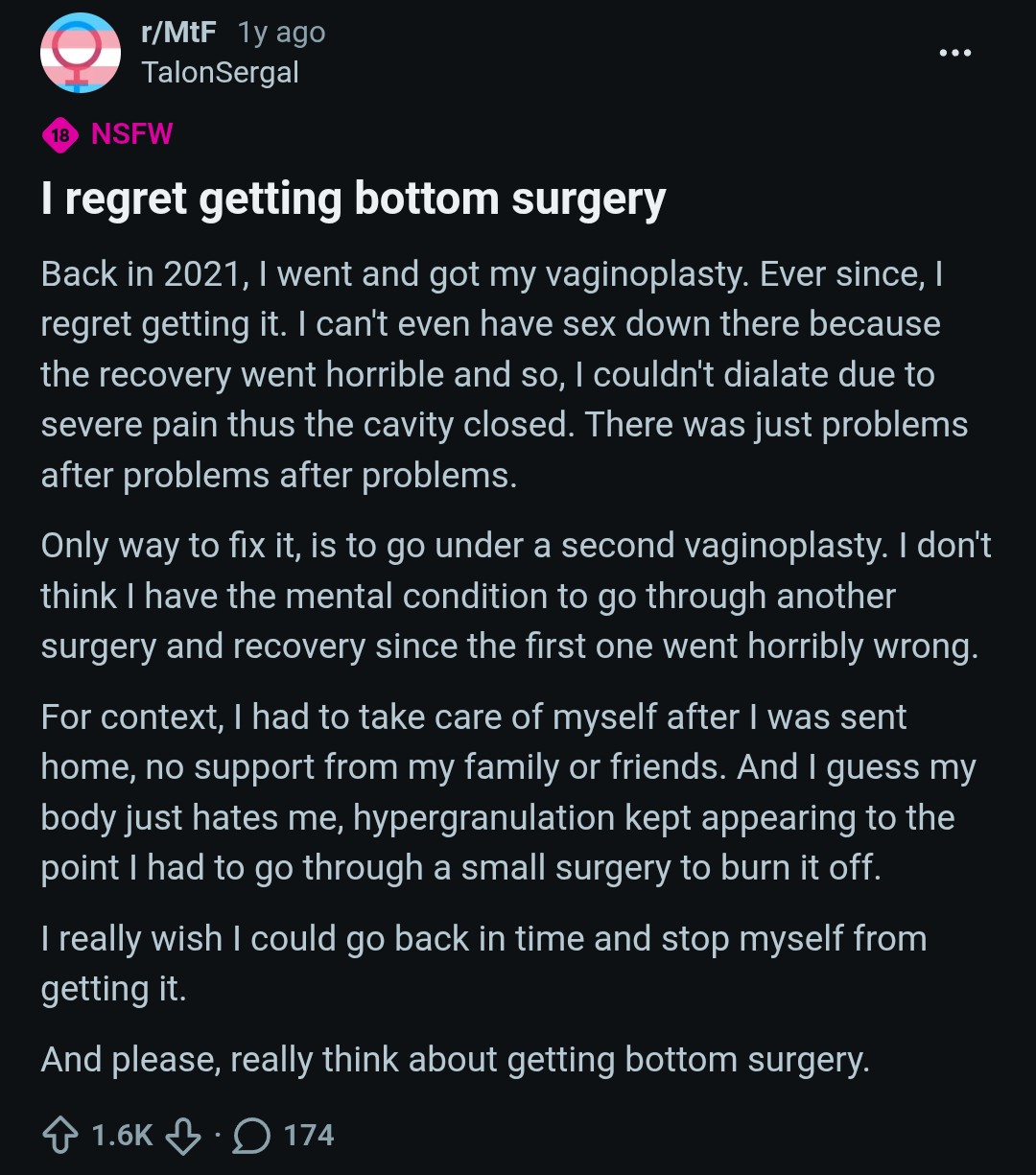 >there is no safe effective reliable surgery to turn small penis into big penis>this would be a trillion dollar industry if it existed, so the profit motive to create such a procedure is obvious>"Even though they can't do 'small penis to big penis', I definitely trust their ability to do 'small penis to vagina' or 'vagina to small penis'Be trans if you want to. Leave your genitals alone, docs can't replace them.