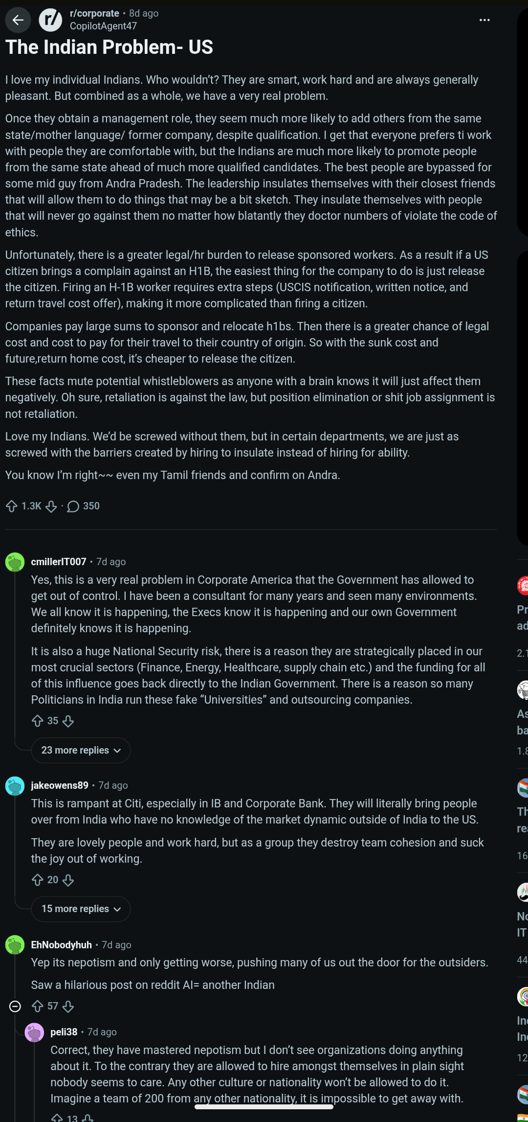 >>533701874In fact this is exactly how the post goes:>Henlo my fellow whites!>Indians are totally bharat and super smart who doesn't love us uhh I mean them>But what's up with my Indian boss he is promoting everyone outside our cast! >Even my Sri Lankan jeet brothers from andraoradeshgu know this amirite bros?>I'd complain but I'm worried I will lose my visa, oops I mean I'm worried Ranjeesh will lose his visa!!