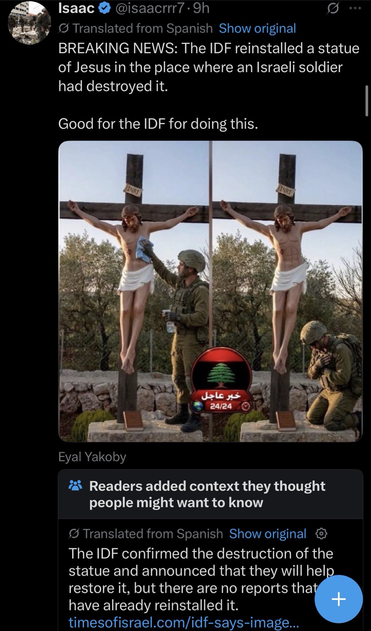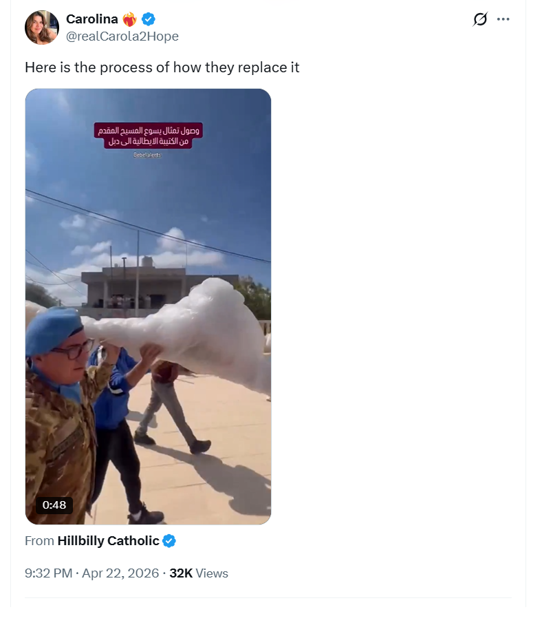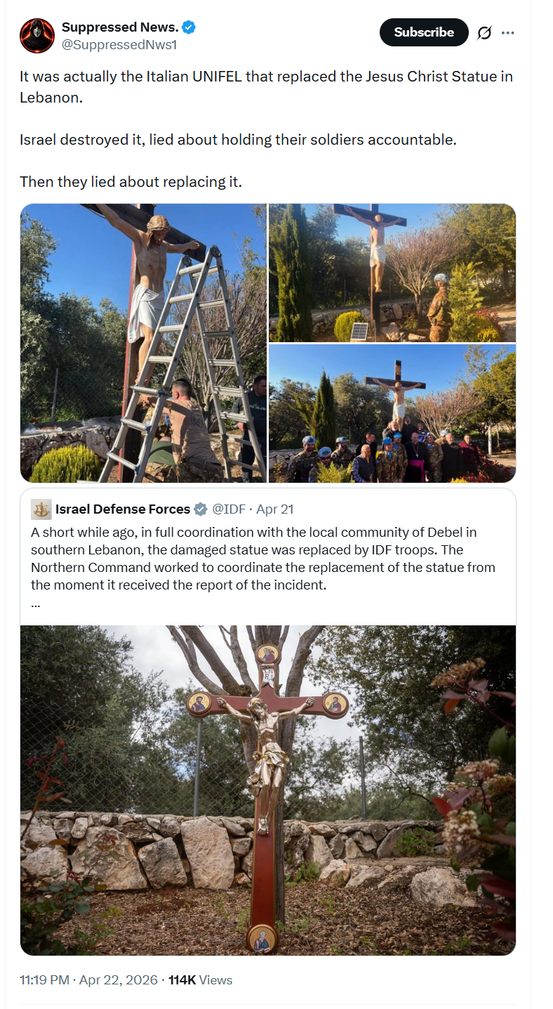 >>533692161Israel already replaced it with a new one.Breaking a statue of Jesus in Lebanon: The soldier and the photographer were dismissed and sent to 30 days of detention, the IDF delivered a new statueThe IDF published the conclusions of the investigation following the damage to a Christian religious symbol in southern Lebanon: The soldier who smashed the statue and the soldier who documented the act were dismissed from combat and will serve a prison sentence. Six additional soldiers who stood by were summoned for questioning.Chief of Staff Eyal Zamir accepted the findings and determined that this was a "moral failure" and a complete violation of army orders. In addition, the IDF delivered a new statue of Jesus to a village in southern Lebanon.