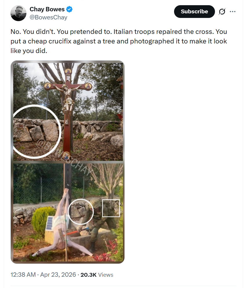 >>533692161I am so sorry that as Christians we want to discuss the IDF destroying Christian symbols. Please forgive us oh great and wise Jewish advocates.