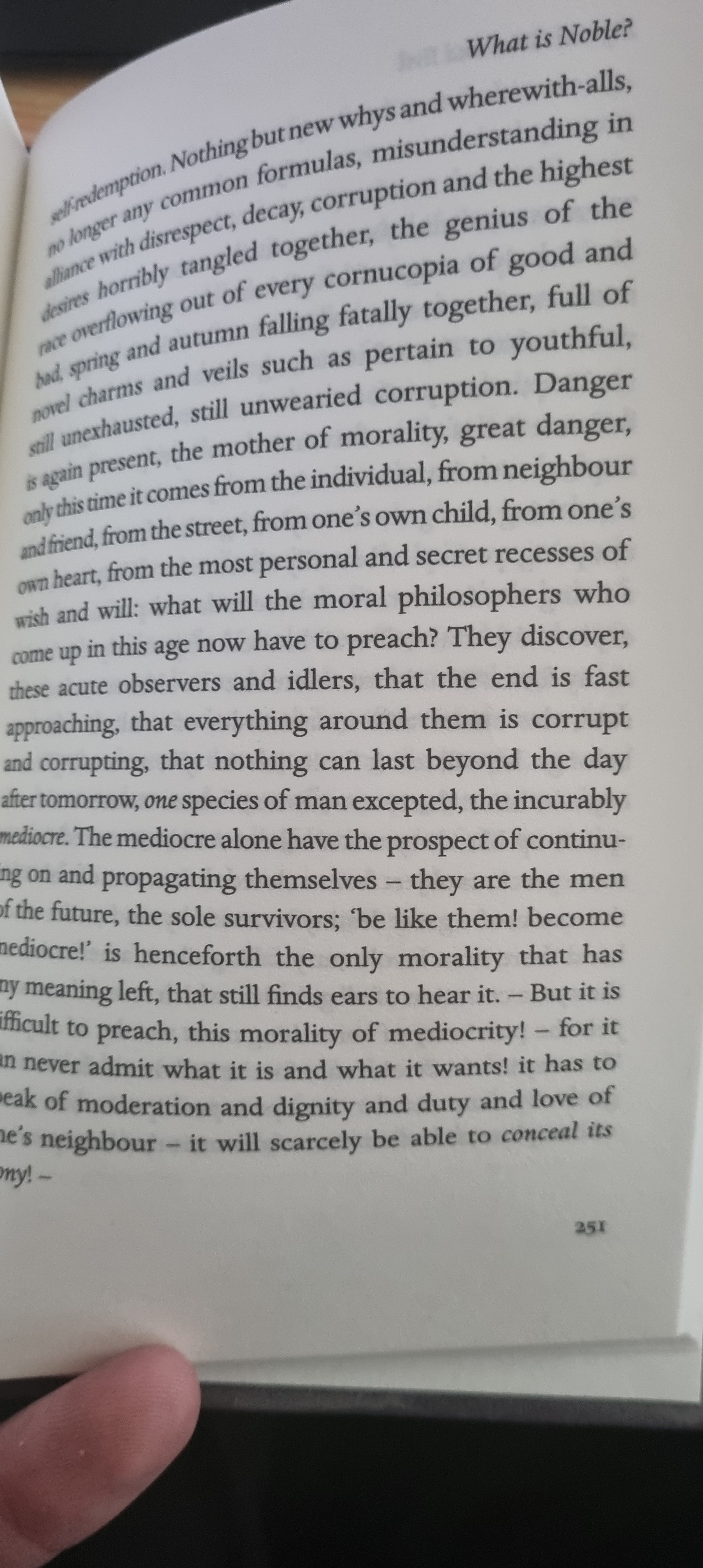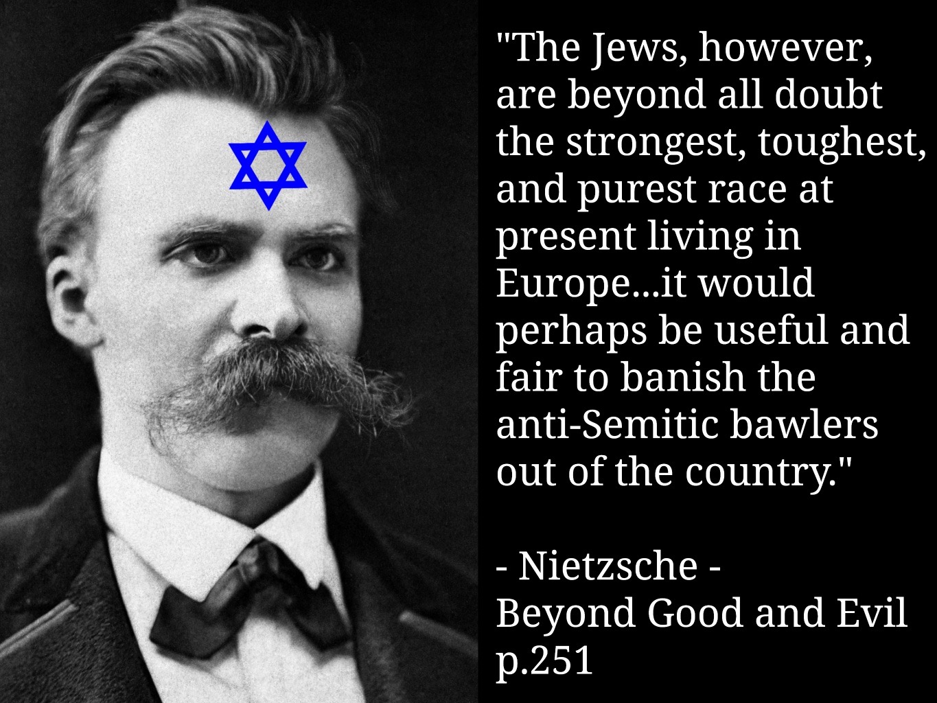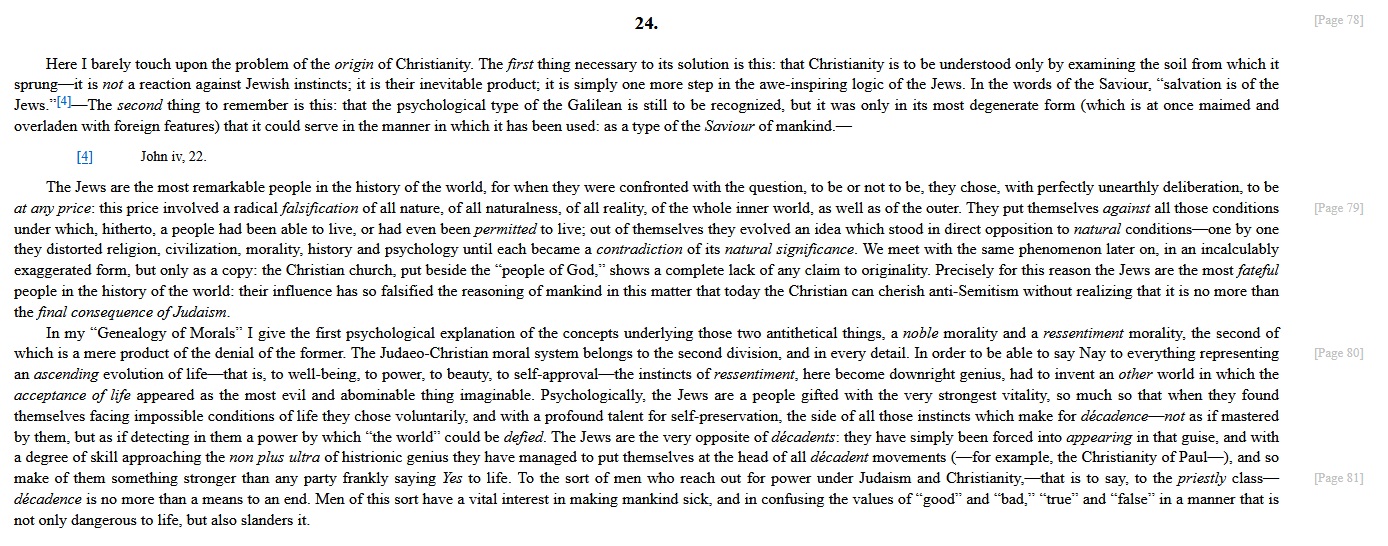 >>533695463nietzsches judeophilia & anti-germanism boils down to them being pragmatists & not dwelling on unrealistic fantasies of peace on earth & mankind united while the naive aryans fall for every trick int he book.the qupte specifically addresses the impotent whining of some antisemites that want the jew to play by the rules because they are so powerless while mater morality teaches that might makes right. christians too just want to shame the strong into obedience & misery with preaching morale & ethics. thats why he hates antisemites. we should either act against whatever oppresses us or shut up about it, not trying to sneak ourselves into power by shaming the opposition.>picrelhe was also dead wrong about the jews in this particular quote so theres that.