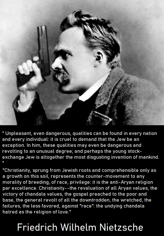 jews act only in the interest of jewsThe Christians of Nietzche's day acted in the interest of all. Nietzsche could see that Christianity was a jewish subversion of Platonism or as he called it "Platonism of the masses". Nietzsche wanted Germans to act solely in their own interest again just as jews only act in their own interest. That is the reason Nietzsche "liked" jews in the sense he wanted Germans to have a master morality and not a slave morality. >>533697596he wasn't against anti-semitism, rather he was against Christian anti-semitism. As Nietzsche said "You who oppose Judaism, why did you adopt their religion?" He is pointing out that Christians can never be true anti-semites because their religion is based on jewish teachings, which is why today all you see is christian worshipping jews.