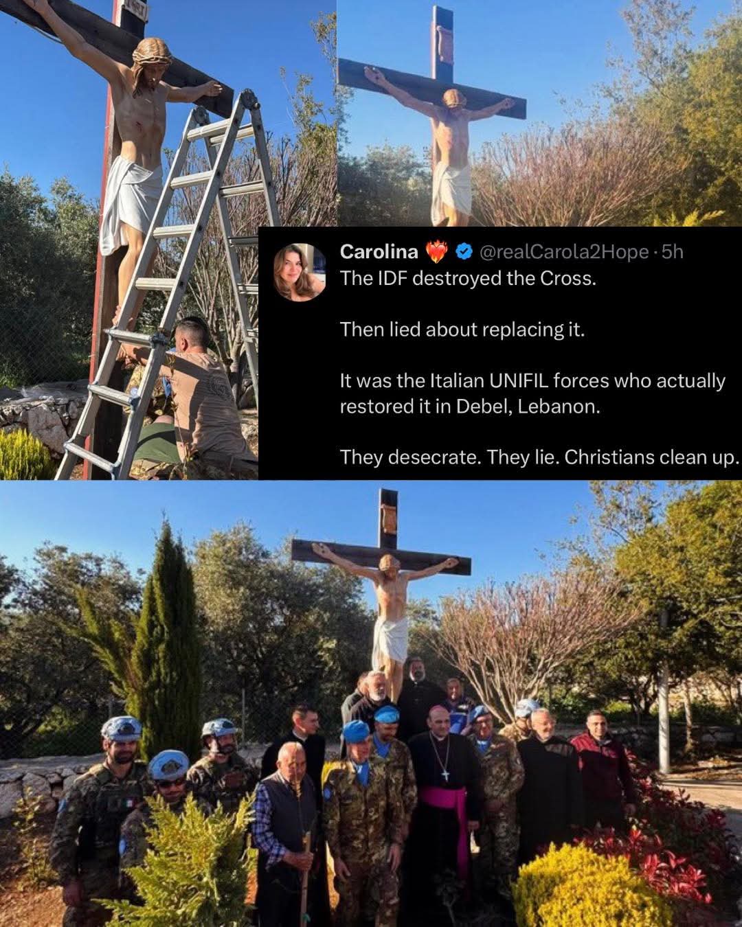 >>533696155It's not real. That's a 6 inch wall crucifix the IDF photoshopped and posted. The real crucifix was restored by Italian soldiershttps://x.com/RadioGenoa/status/2047105720517009659