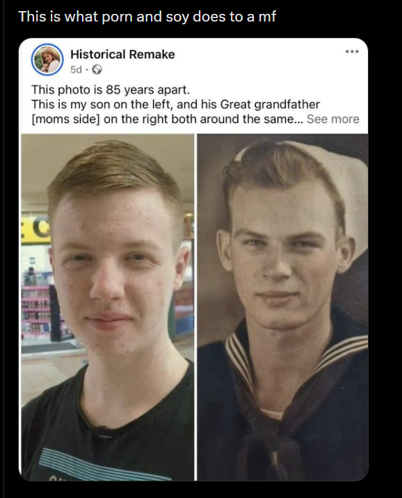 Oh man, you can see in in their faces! The great grandpa was totally based and the grandson watches a lot of porn and believes in jewish media! You can feel it!Kek I like chuds but sometimes they're really fucking stupid.