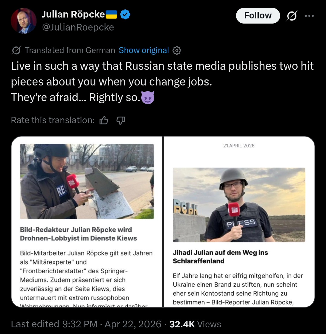 >Live in such a way that Russian state media publishes two hit pieces about you when you change jobs.>They're afraid... Rightly so.