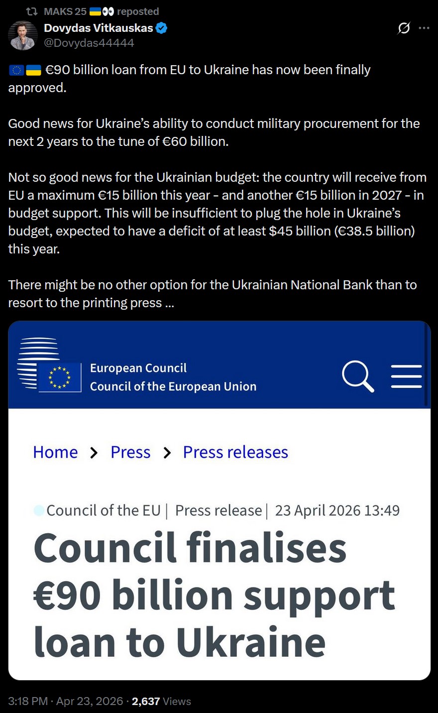 >>533707270the ukraine wonned a yuge loan>€90 billion loan from EU to Ukraine has now been finally approved. >Good news for Ukraine’s ability to conduct military procurement for the next 2 years to the tune of €60 billion. >Not so good news for the Ukrainian budget: the country will receive from EU a maximum €15 billion this year - and another €15 billion in 2027 - in budget support. This will be insufficient to plug the hole in Ukraine’s budget, expected to have a deficit of at least $45 billion (€38.5 billion) this year. >There might be no other option for the Ukrainian National Bank than to resort to the printing press …