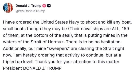 >President Donald Trump: I have ordered the U.S. Navy to fire at any boat that lays mines in the waters of the Strait of Hormuz Ghost of Mosquito Fleet is haunting orange nugget.