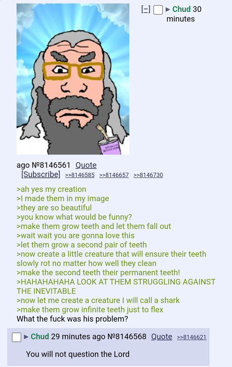 >>533704156If this fairy tale is true, or even has some factual basis, then yes God really is a prick. His arrogance and disdain for his own creation caused him to unleash divine punishment onto all, even people that had nothing to do with it many generations into the future. Just like Adam and Eve.