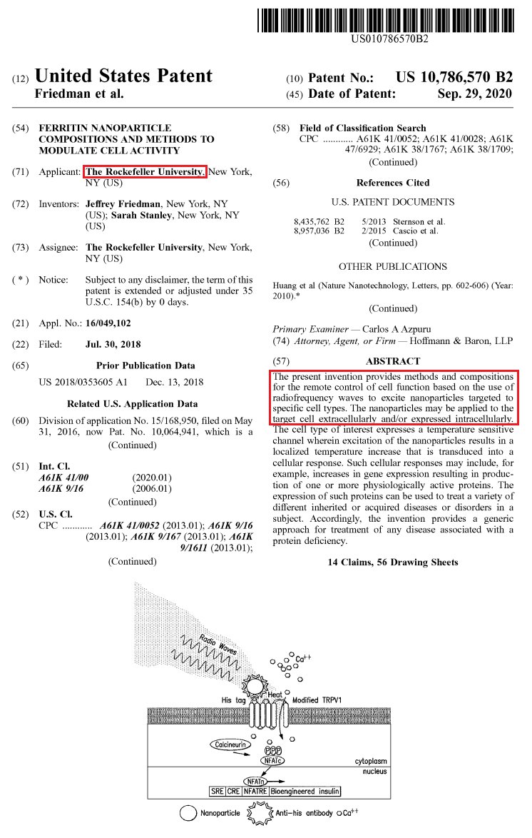 #BREAKINGSHOCKING DOCUMENT:THEY HAVE OBTAINED A PATENT TO REMOTELY CONTROL THE HUMAN BODY!Oh my God, this is not a conspiracy theory, it's an official government document!The global elite's “Kabal”-centered plans have been exposed.Does that patent registered in the name of Rockefeller University mean the end of humanity's biological independence?NANO-PARTICLES AND CELL MODULATION: IS OUR BODY NOW A REMOTE CONTROL?The revealed United States Patent No. US10786570 unveils the blood-curdling truth.According to the document: remotely modulating (directing) cell activities using “Ferritin Nanoparticle Compositions” is now technically possible.5G AND mRNA CONNECTION: REMOTE ACCESS SIGNAL!Radio frequency waves (aka 5G technology) are used to remotely manage cell functions by stimulating those nano-particles injected into the body (aka mRNA-based systems).What is the goal?To control human behavior, hormones, and cells with a single signal?