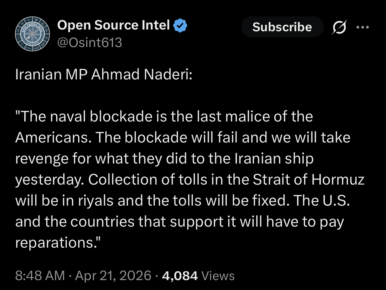 Slightly interesting thing to note is that Iran was previously accepting crypto or yuan. This might indicate either a loss of trust in China, or that the food and water situation is so dire in Iran that they need currency to trade with their near neighbors for those resources.https://x.com/Osint613/status/2046602050985681010
