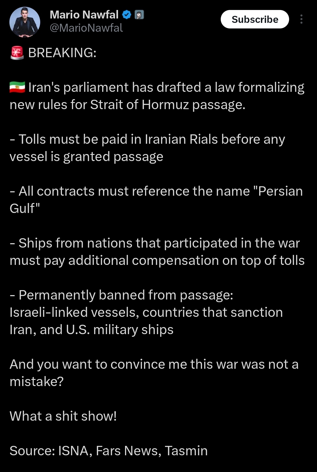 >>533710335Yes, it adds up to about $1 dollar per barrel of oil.This seems like peanuts and will only cost about $2-3 million per tanker for transit fees. When they are doing this 10-20 times a day it adds up QUICK!!!!!!!! Think about how rich Iran would be with $20-$50 million PER DAY injected into their economy.Shits so cash and Trump listened to the wrong people again. Fell for it again award goes to Orange Man Bad. HONKHONK
