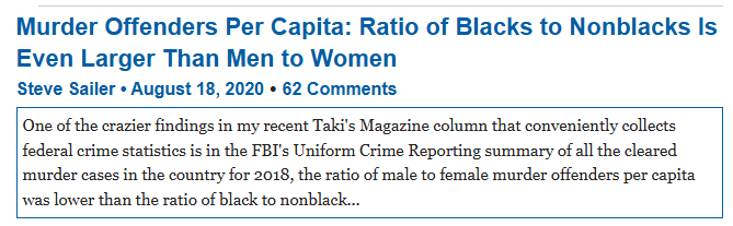 >>533719683>few thousand guys doing all the murders Yeah that’s what I’d expect. There’s only a few thousand murders a year. I think 10k or so by gunshot. and guns are probably the primary murder weapon, so I wouldn’t expect there to be too many murders committed by, like, knives or fists or blunt instruments.>recidivismYeah it would be great if we didn’t let murderers go or give them comically lenient sentences just because they’re teenagers. Let’s start here: If you have a murder suspect, and the probability of his innocence is zero (he live-streamed it, let’s say), the penalty ought to be death, administered the same day the verdict is read.