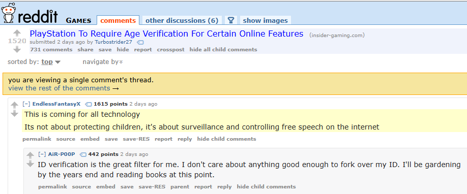 >>533712016I think when they first started to issue papers to peasants in Russian Empire they also thought it was the mark of the beast that was mentioned in the Apocalypse.Let's be real it may look shit for us who remember old anonymous and how google adviced to never leave your personal data online but the modern youngster are born with a smartphones in their mouth and leave a digital footprints on their way out of nursery; taking a pic of their ID won't really be that big of a deal for them so they will eventually normalize it.
