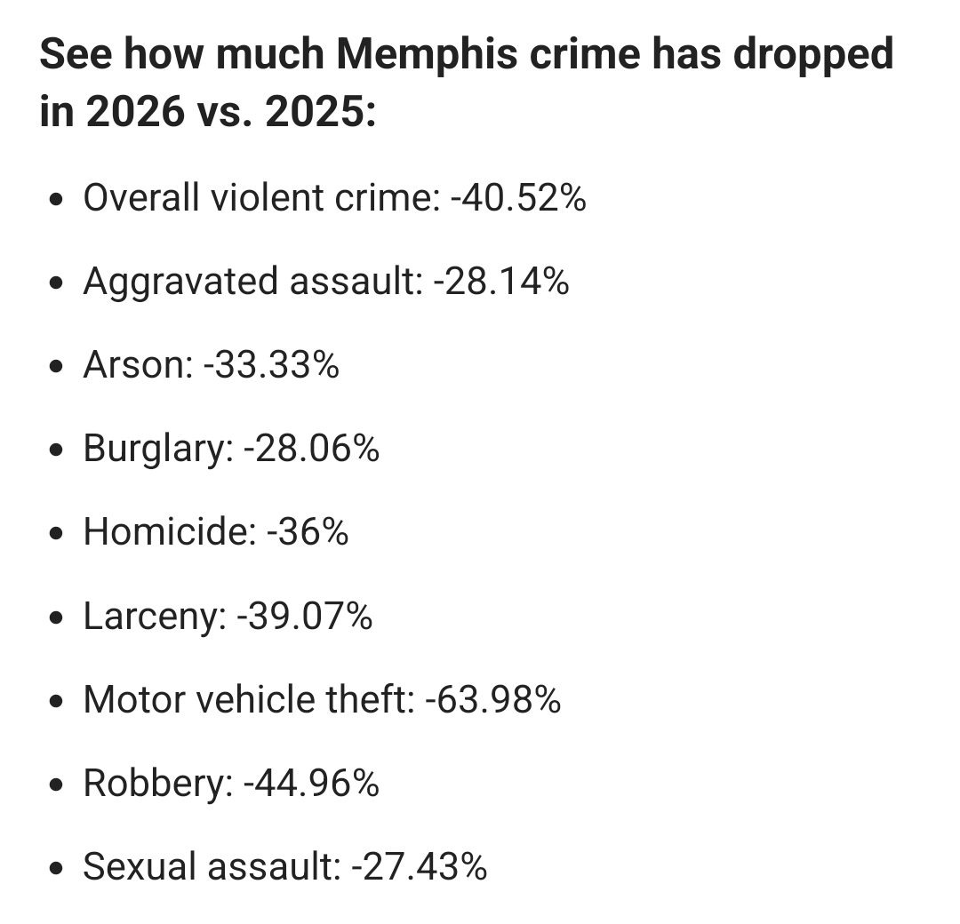 >Data from the Memphis Police Department shows violent crime is down over 40% so far in 2026 compared to the same period last year, following President Donald Trump's establishment of the Memphis Safe Task Force — a coalition of local, state and federal law enforcement agencies and the Tennessee National Guard.