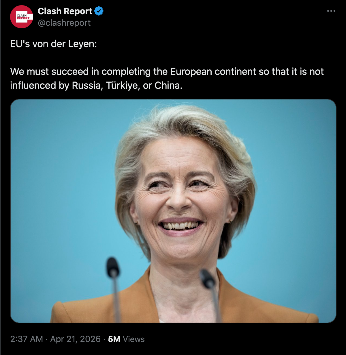 >>533720441Fake news. Clash Report is Turkey affiliated and has posted fake quotes in the past. Von de Leyen has never said that. I mean, it's a nonsensical statement on the face of it. Russia, China, and... Turkey. Utter hogwash. So you should already know she never said it even before googling that shit and finding out she indeed never said any such thing. These threads have got to be full of bots because I remember seeing some of the same responses in the same thread the other day. For example I remember a Finn flag posting either this exact same thing or something very similar to it then too: >>533724066