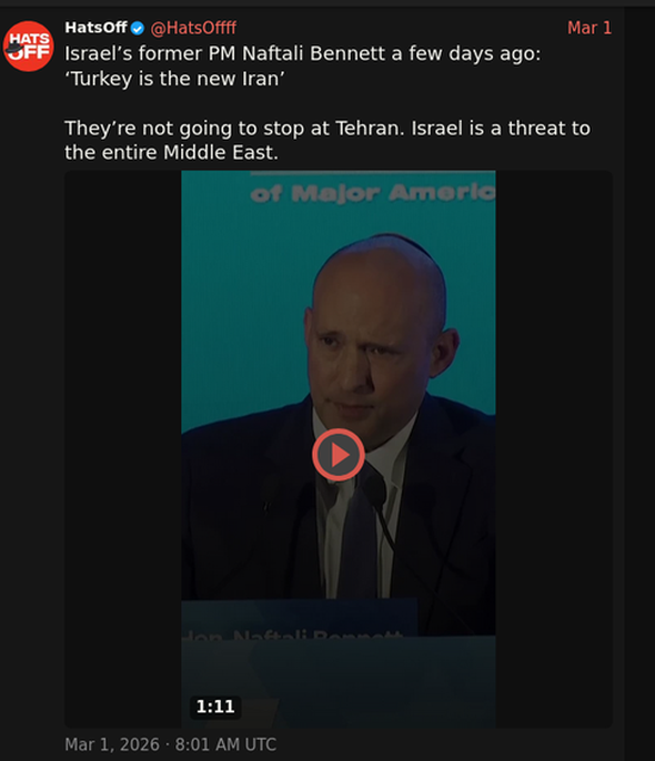 >turkeyyeah, ok... Remember Joe Kent's tweet from a week or so ago. If they do try to pull out of NATO it will be to further israeli plans to go to war with Turkey, a NATO ally.