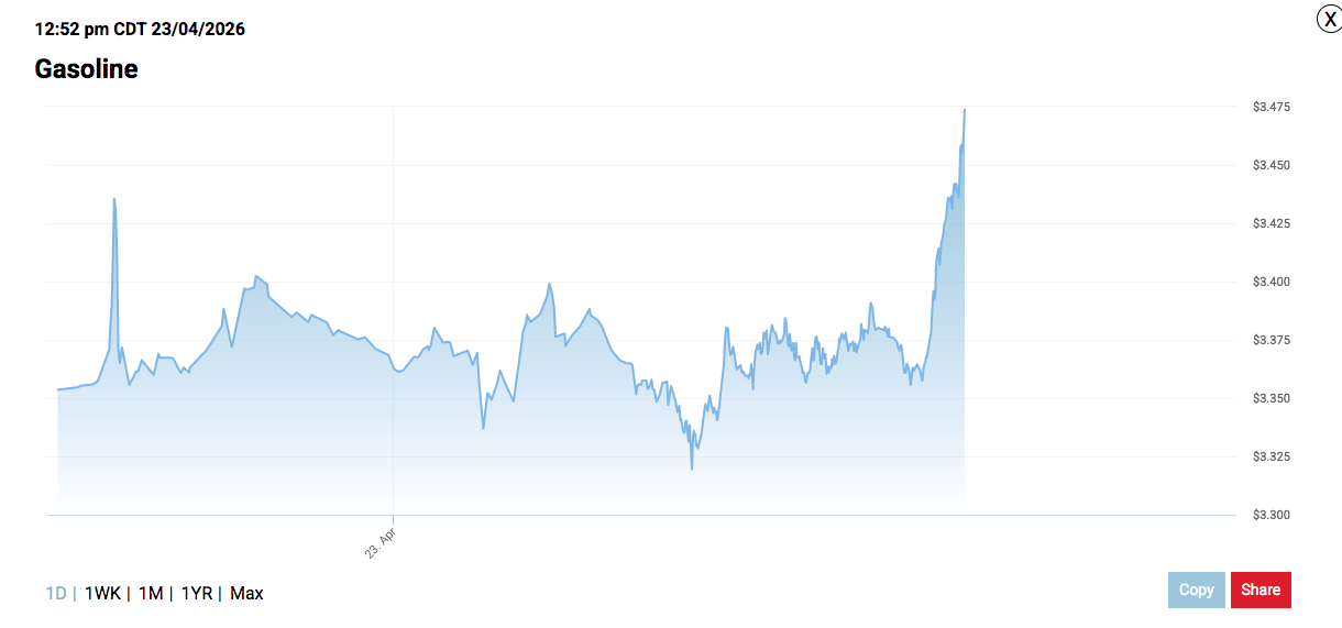 Breaking; Gasoline Spot Price Hits New Wartime High For Second Day >$3.38 New Iran wartime high today>$3.30 Previous Iran wartime high (April 6th)>$1.69 Pre-war low. (Jan. 7th)