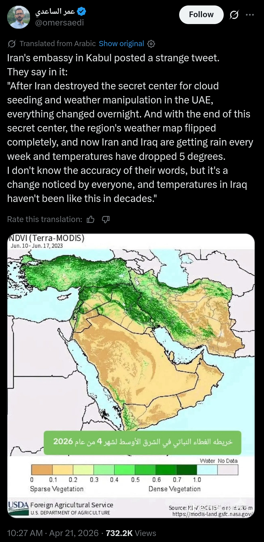 >>533724968>Maybe the Iranian Government was right?Iran has accused US-Israel of weather weaponization against them for 13 years. Iran blows up massive US radar arrays and it has since rained and refilled reservoirs. The technology exists, the US has that weapon.https://www.reuters.com/article/world/ahmadinejad-says-enemies-destroy-irans-rain-clouds-reports-idUSBRE88A13H/