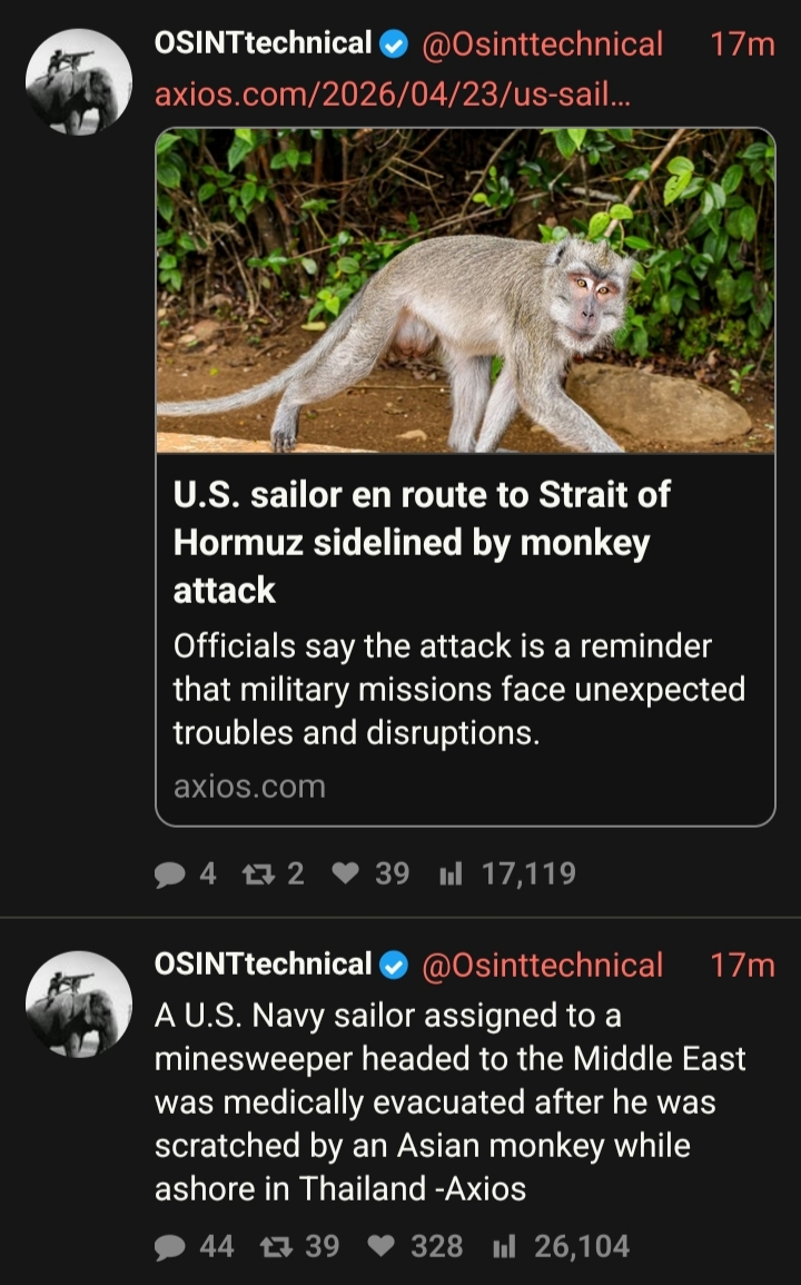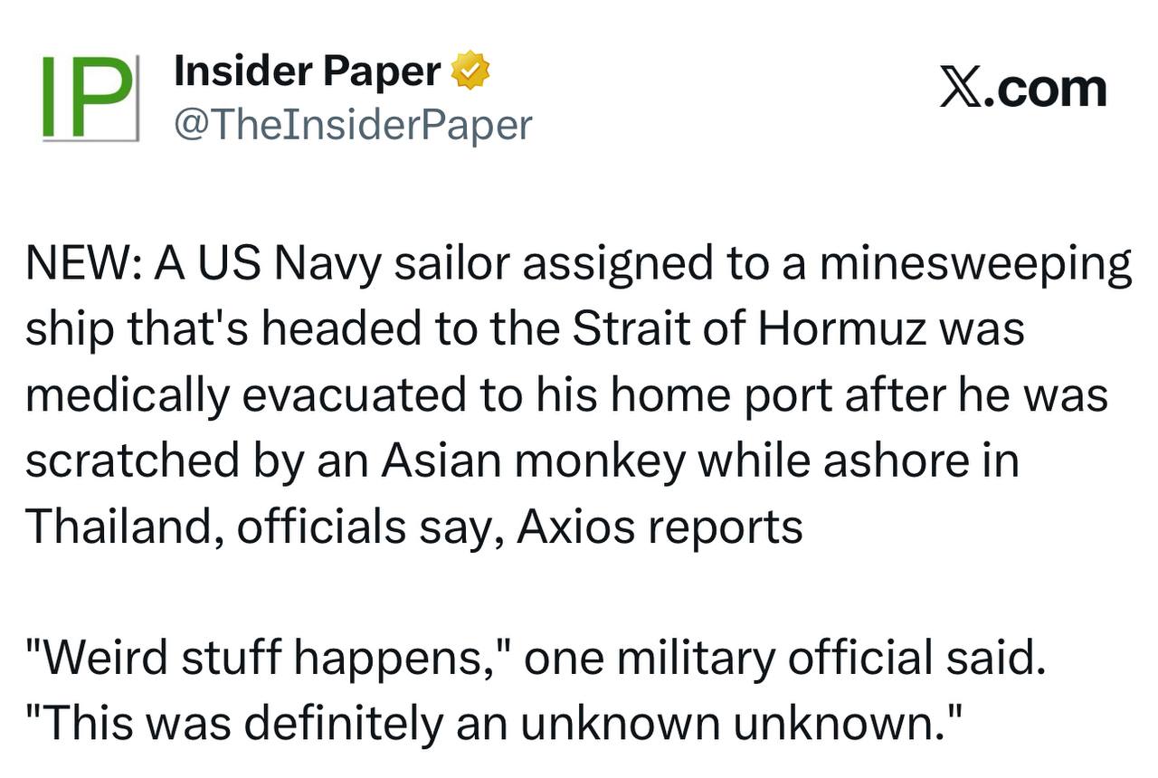 — A U.S. Navy electronics technician assigned to a minesweeping vessel bound for the Strait of Hormuz was medically evacuated after being scratched by a monkey during a stop in Thailand, Axios reports. The sailor, serving aboard the USS Chief (MCM-14), encountered the monkey and was injured while ashore in Phuket and later transferred to a U.S. base in Japan for treatment. Officials said the incident did not affect the ship’s mission or operations.