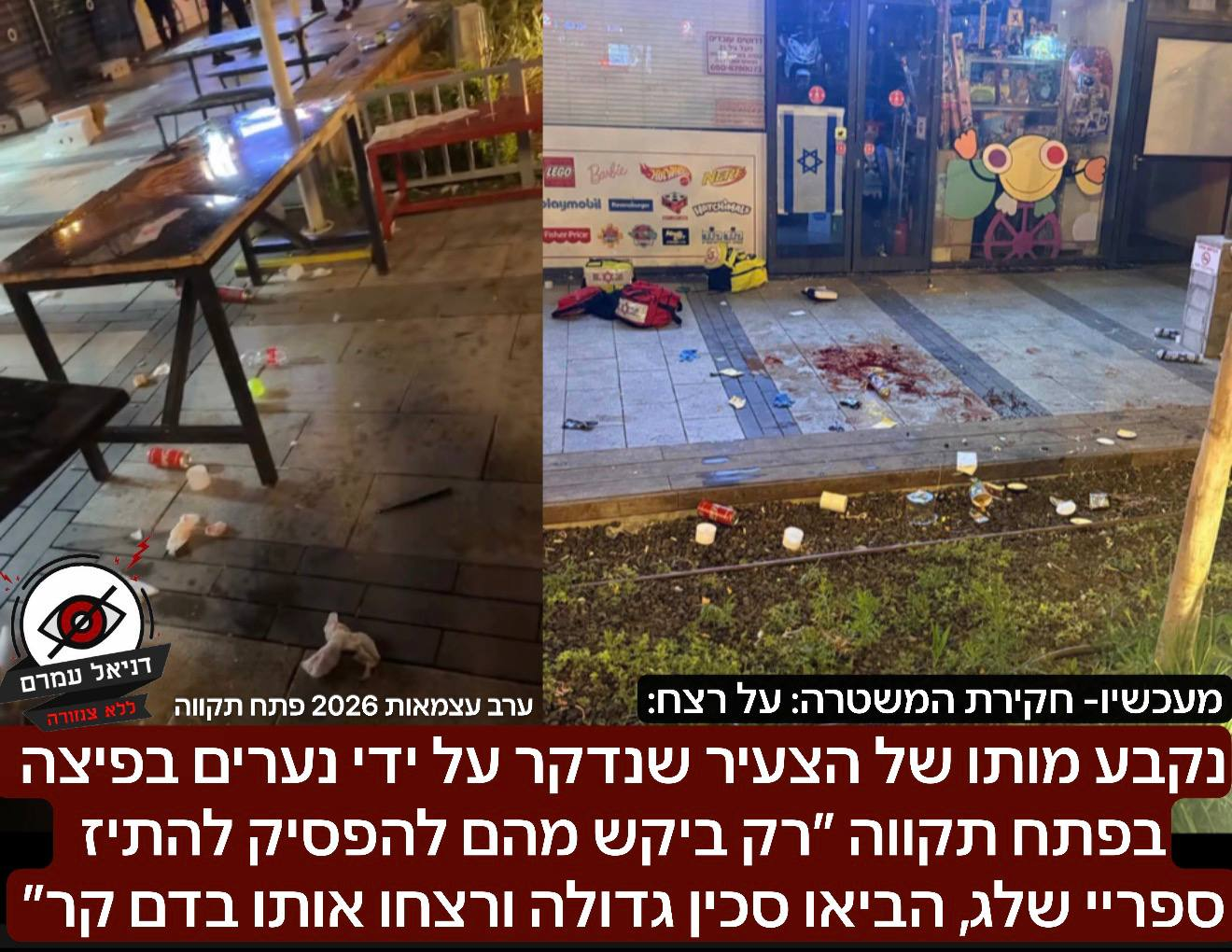 The death of the young man who was stabbed by teenagers at a pizza place in Petah Tikva has been confirmed. "He only asked them to stop spraying snow spray, they brought a large knife and murdered him in cold blood": One of the horrifying incidents that happened here. Once we receive the family's approval, we will add his name and picture here, but according to his friends, he was an amazing kid who worked for a living at the pizza place. He tried to close the shop and asked the teenagers to stop spraying snow spray on him. They left the place and returned with a large knife, according to an eyewitness, and stabbed him brutally before fleeing. After several days of attempts to save him, his death was confirmed at the hospital.