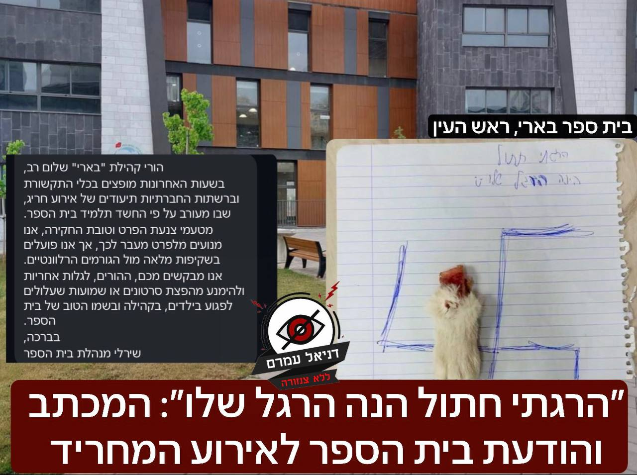 "I killed a cat, here is its leg": The letter and the school's message about the horrifying event: According to testimonies, it involves a "problematic" student, who previously caused an uproar when he drew a swastika on the board and claimed he wanted "attention." A short while ago, the principal of the Barry school in Rosh HaAyin informed parents that it involves a student at the school but did not detail the event and requested not to spread videos and to respect the school's dignity and privacy.