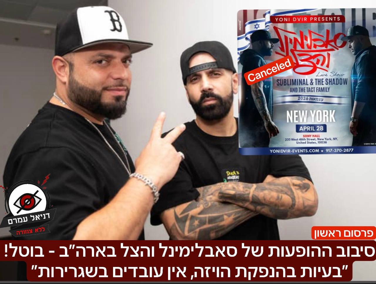 >>533731672Subliminal and HaTzel's US tour - canceled! "Visa issuance problems, no staff at the embassy": In a last-minute announcement, and after almost all shows were sold out, it was revealed that there are difficulties obtaining an artist visa at the US embassy in Israel, due to the fact that there are no staff at the embassy. Producer Yoni Dvir: "I was out of control of the event, they came to another show in Miami and we jumped on it to do a tour across the US, they updated me at the last minute."