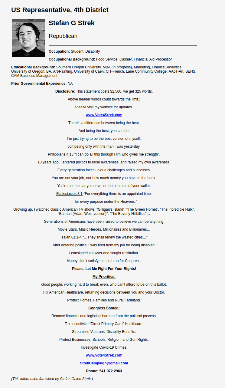 So I got my voter's pamphlet in the mail today and I would like to ask which one of you is this?>Only started caring about politics when Trump first ran>Random bible quotes>Obsessed with capeshit>TPUSA>30 years old still in school>5'0">Autistic>Obsessed with guns, cats, and ayyylmaos>Work history: fast food and disability>Got fired from his fast food job for being autistic>Friends with Nick Shirley somehow??>"On his Facebook page, Strek writes things like, “Reasons women are like cats,” — he gives 13 of them — and he reminisces about skipping class in high school to “drink malt liquor” and “get laid.”>Addresses the Eugene City Council so he can discuss his cat "Flubbers"This nigger 100% posts here and I know there are at least two other Oregonians in /ptg/https://oregonvotes.gov/voters-guide/english/votersguide.html#Stefan%20G%20Strekhttps://www.youtube.com/watch?v=OqJzTWShMrohttps://www.vote4strek.com/