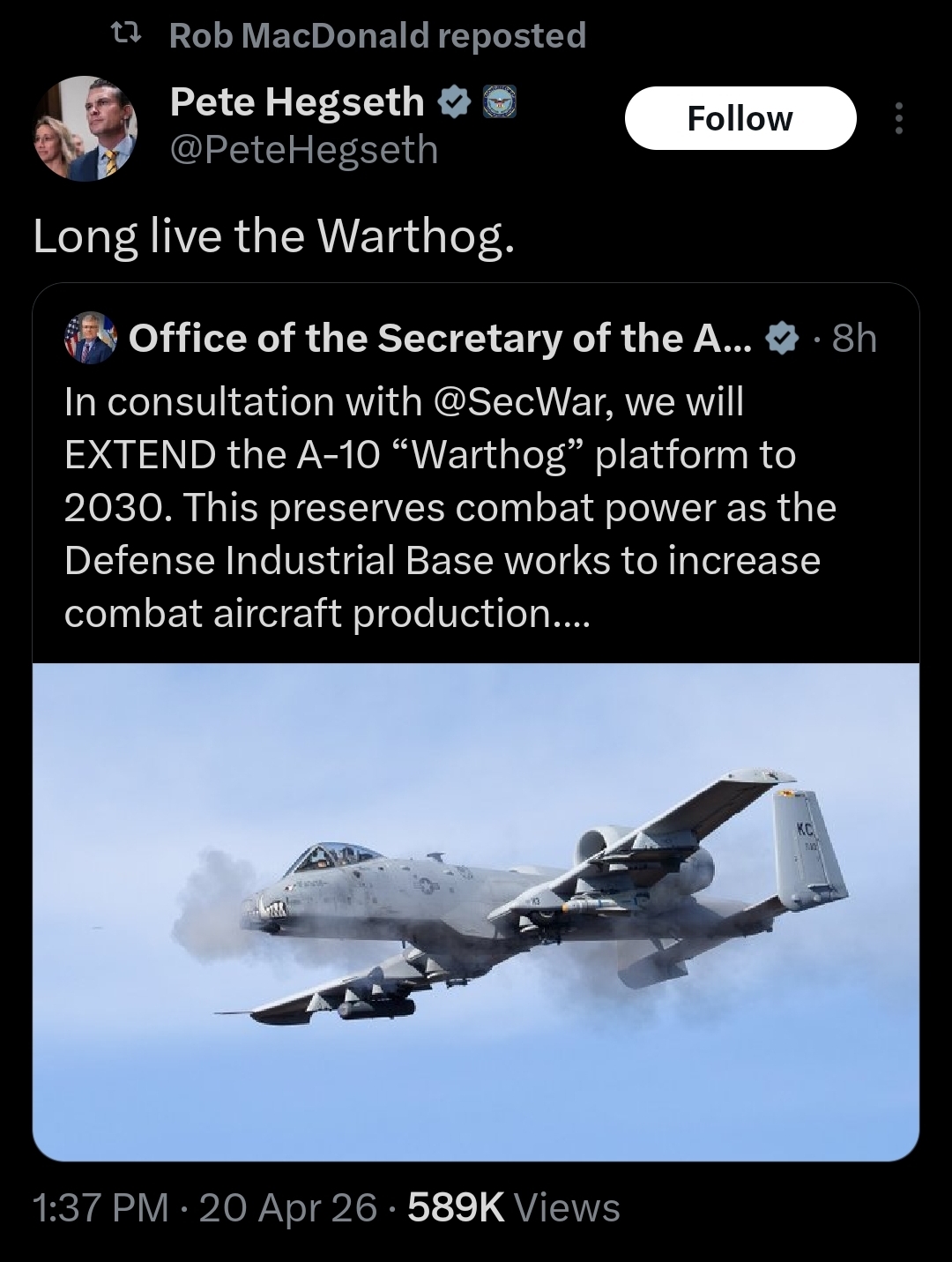 >>533731293>>533733251The A-10 is cool but it's old as fuck and increasingly time consuming to maintain. It's not that the platform itself isn't useful it's just that they're so ancient now that they're in maintenance more than they're available for use. It wouldn't be a bad idea (if it's even possible 50 years later) to just update the aircraft design and turn out another couple hundred next generation A-10s because they certainly fill an important CAS gap that no other aircraft now or planned in the future is able to fill.