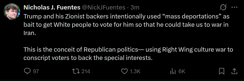 >Trump and his Zionist backers intentionally used “mass deportations” as bait to get White people to vote for him so that he could take us to war in Iran.>This is the conceit of Republican politics— using Right Wing culture war to conscript voters to back the special interests.he's right you know....