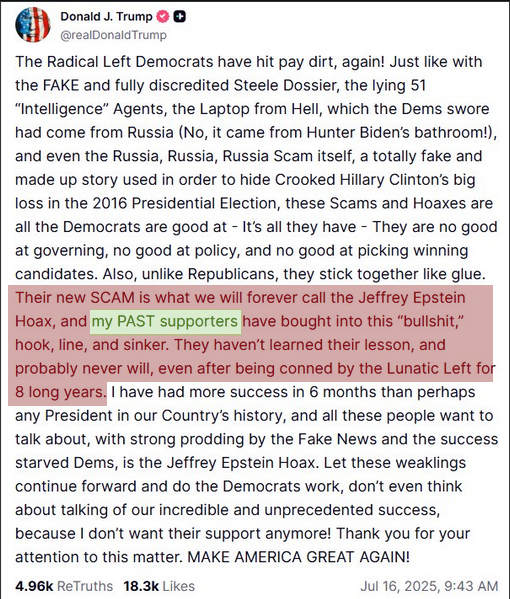 >>533734621Stick your head in the sand like an Ostrich and maybe it wont all be real. He told us not to support him. Everything in this truth social post.. see all that stuff? Nobody has yet to be held accountable. How much more of a ass fucking do you actually need?