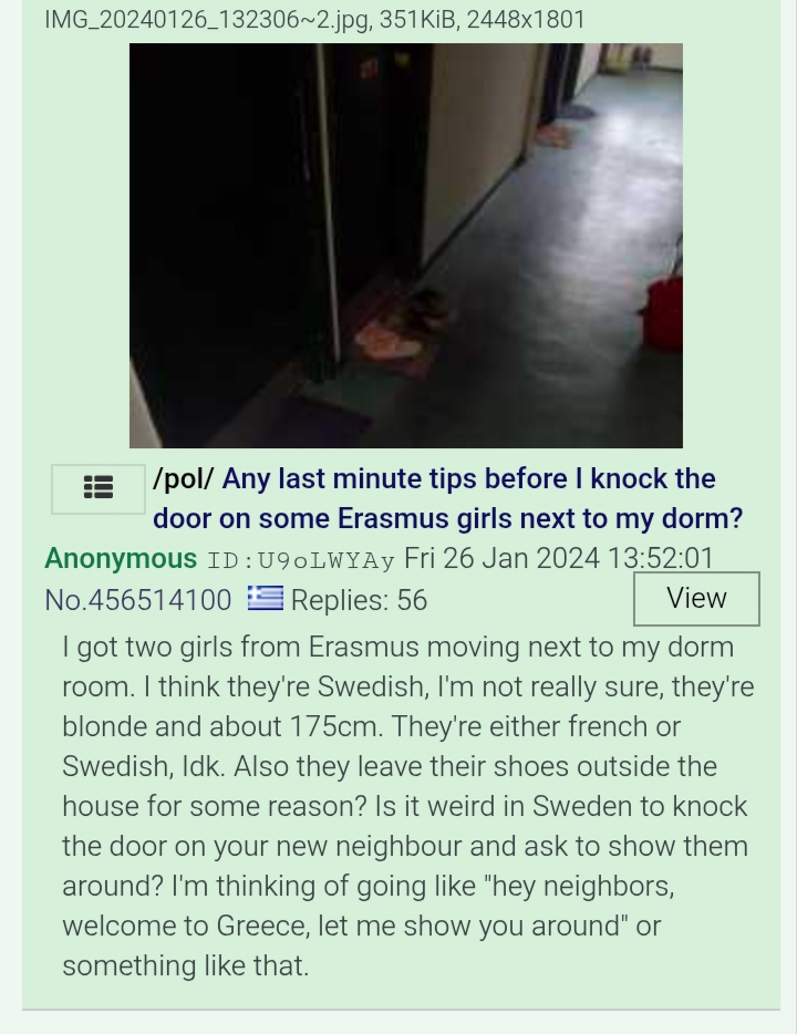 >Original Source: https://lawandorder.gr/o-argentinos-zogkler-i-touristria-apo-tin-souidia-kai-dorean-diamoni-stin-panepistimioupoli-zografou/>Video from the raid: https://streamable.com/9gtir8Greek /pol/ guy who got arrested in March 2024 at the University of Athens had been living in his dorm for over 16 years. The university finally moved to evict him after it turned out he was illegally subletting rooms to Europeans through a Telegram group and making money off it.Inside his dorm room, a Swedish woman and an Argentinian juggler were found; the Swedish woman is presumed to be his girlfriend. Picrel is herThis is what she told the police:>I am from Sweden, and it has always been a dream of mine to travel to Greece. I reached out to a community in Sweden, and the students there told me that the student dorms in Athens were a place where I could go and stay for as long as I wanted, free of chargeIt is worth noting that all charges against them have been dropped but disorderly conduct which is a laughable misdemeanor