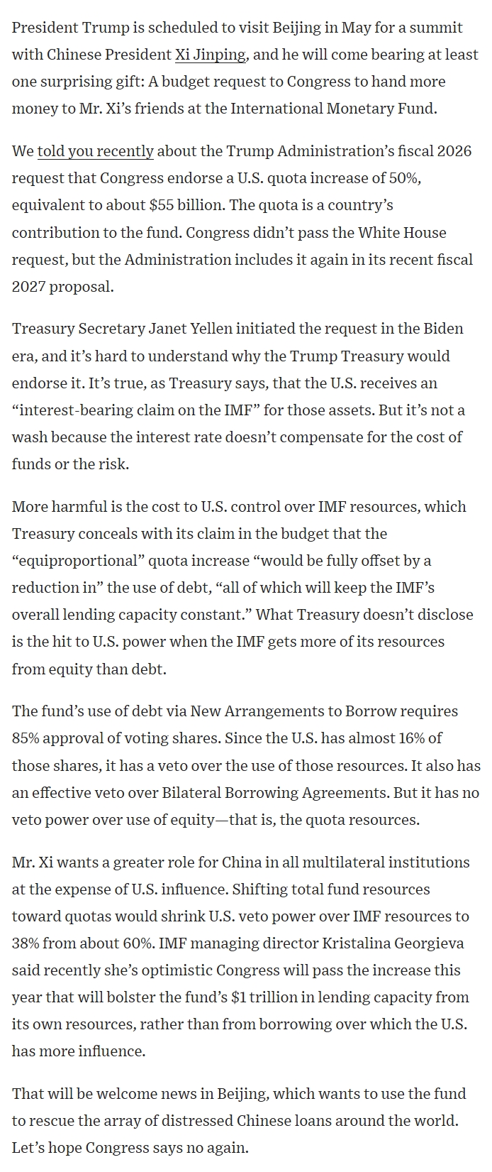 >>533745230The issue is that, according to IMF rules, when equity capital is increased, the allocation of shares is based on the country's share of the global economy. Since china has a significantly larger share and the US a significantly smaller one as at the time of the last increase, china is allowed to subscribe to more capital and thus holds a larger share.