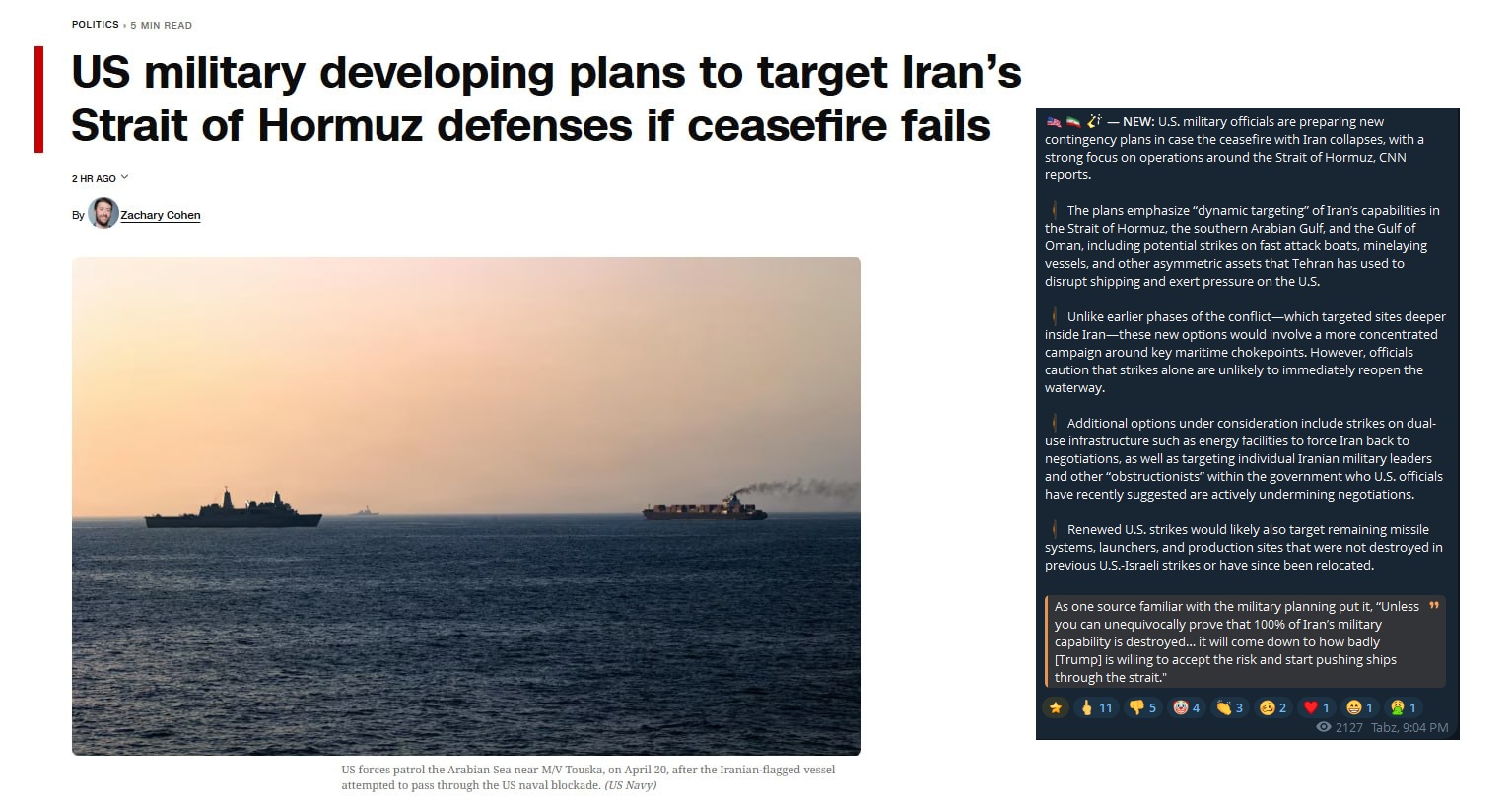 Prev: >>533739479Day: 16 of the 14-day Ceasefire™ with IranDay: 55 of the 1-day "Special Military Operation™ to decapitate Iran"Day: 7 of the 10-day Ceasefire™ with Lebanon▶RECENT:>Trump announced he ordered the U.S. Navy to "shoot and kill any boat... that is putting mines in the" Strait of Hormuz.>Senior Israeli official says preparations are underway for approval from the Trump administration to resume hostilities — Channel 13>The UK Maritime Trade Operations Center reported a security incident 83 miles southeast off Somalia.>Israeli artillery shelling in Khiam, Lebanon.>No strikes have been confirmed by reliable sources in Iran. It was probably air defense drills. We'll know for sure in the coming hours.>Blasts reported in Isfahan, eastern Iran.>Drone attacks against Erbil, Iraqi Kurdistan.>Somalia announces a ban on all Israeli ships passing Bab Al-Mandab.>Iran insists it will not agree to talks until the USA removes its naval blockade and recognizes the rights of the Iranian nation.▶WARNING:>Do not trust any "happenings" without link/proof>Uкraine / Яussia discussions belong in uнg or cнug▶Thread Theme:https://litter.catbox.moe/ej0yhu.mp4▶Oil:https://oilprice.com/oil-price-charts/▶Cargo Transits through Strait of Hormuz:https://hormuztracking.com/▶Kino:https://files.catbox.moe/og2wvv.mp4https://files.catbox.moe/dqr3fl.mp4https://files.catbox.moe/jg9rat.mp4https://files.catbox.moe/fx86zj.mp4https://files.catbox.moe/cbd7ug.mp4▶Live-streams:https://www.youtube.com/watch?v=4E-iFtUM2kkhttps://www.youtube.com/watch?v=TdcrT5OcS9chttps://www.youtube.com/watch?v=53G-Oy4r6M4▶Telegram Channels:https://rentry.org/tgnews▶Israel Rocket Alerts:https://www.tzevaadom.co.il/en/▶Air Traffic:https://www.flightradar24.com/https://flightaware.com/livehttps://globe.adsbexchange.com/▶Maritime Traffic:https://www.marinetraffic.com/https://www.vesselfinder.com/