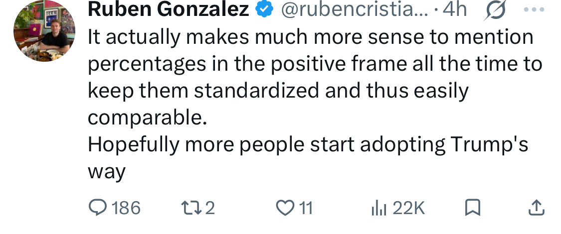 If something is 100 and it went to 200, it's a 100% *increase* or rise as he calls it in the post. That term has a specific mathematical definition, if you dont believe me try this calculator.